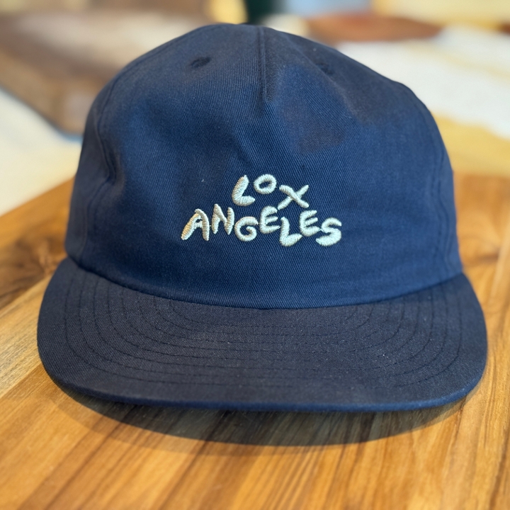 Navy with gold stitching. "Lox Angeles" on the front. "Maury's" on the back. Limited run.