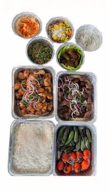 3 skewers chicken breast kabab 3 skewers beef kebab ,5 skewers beef lule kebab, 8 oz hummus,8 oz tabbouleh,5 pieces dolma ,8 oz yogurt & cucumber , rice 24 oz rice & 6 pieces pita bread (good for 3 to 5 person).