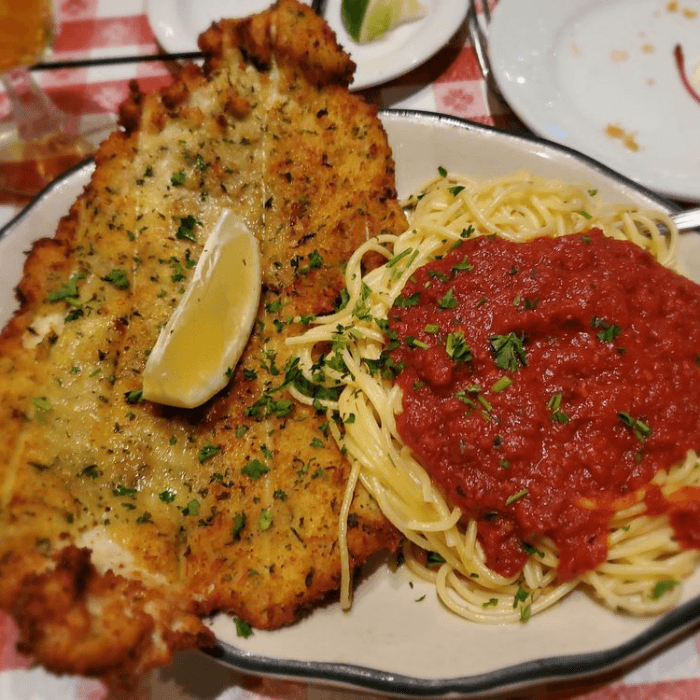 Breaded Chicken Breast, Sautéed in Olive Oil garnished with Lemon Wedges. Served with a side of Spaghetti with Marinara Sauce