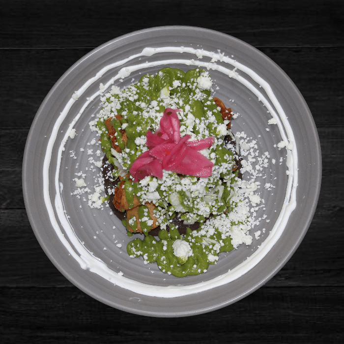 Sauteed onions, tomatoes, cactus, chile de agua, tasajo (beef), melted quesillo, and a touch of epazote. Side of rice, beans and tortilla.