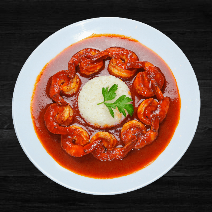 Shirmp in spicy house made sauce side of rice, beans and tortilla