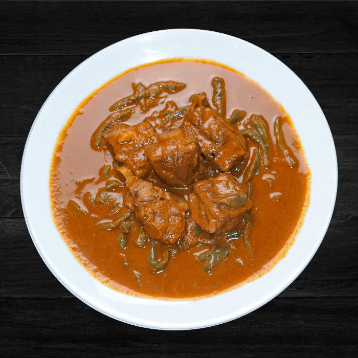 Goat meat slowly cooked in red sauce with hoja de aguacate, side of green salsa, cabbage, lime and tortilla.