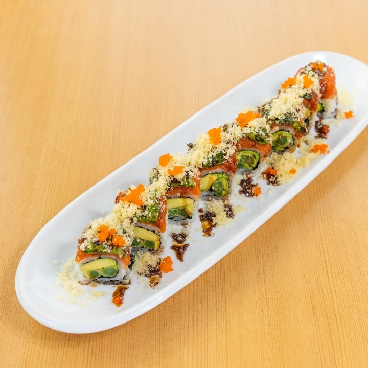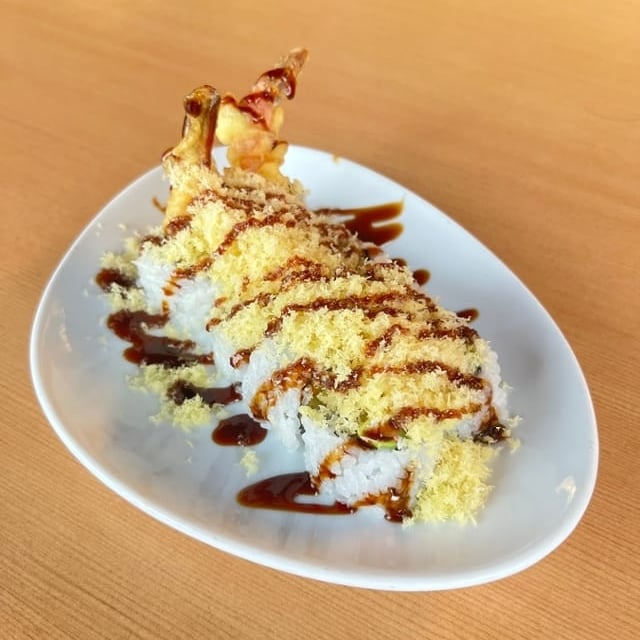 Shrimp tempura, crab, avocado, cucumber, tempura flakes and drizzled with eel sauce.