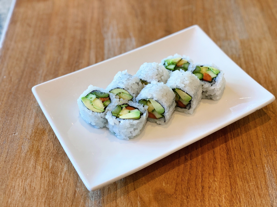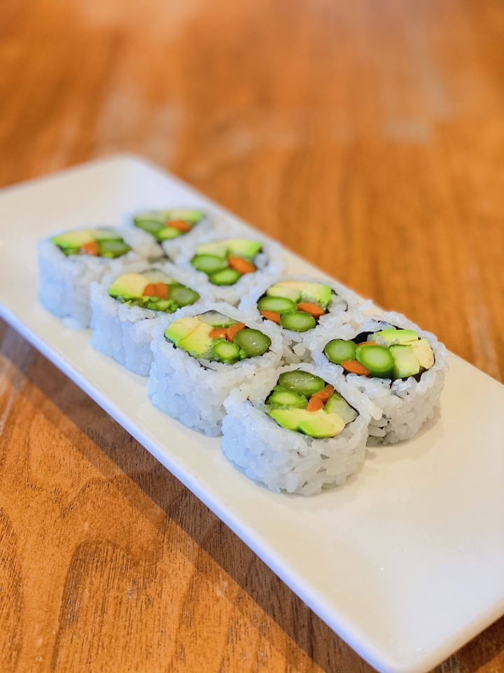 Avocado, asparagus, cucumber, gobo, kaiware sprouts.