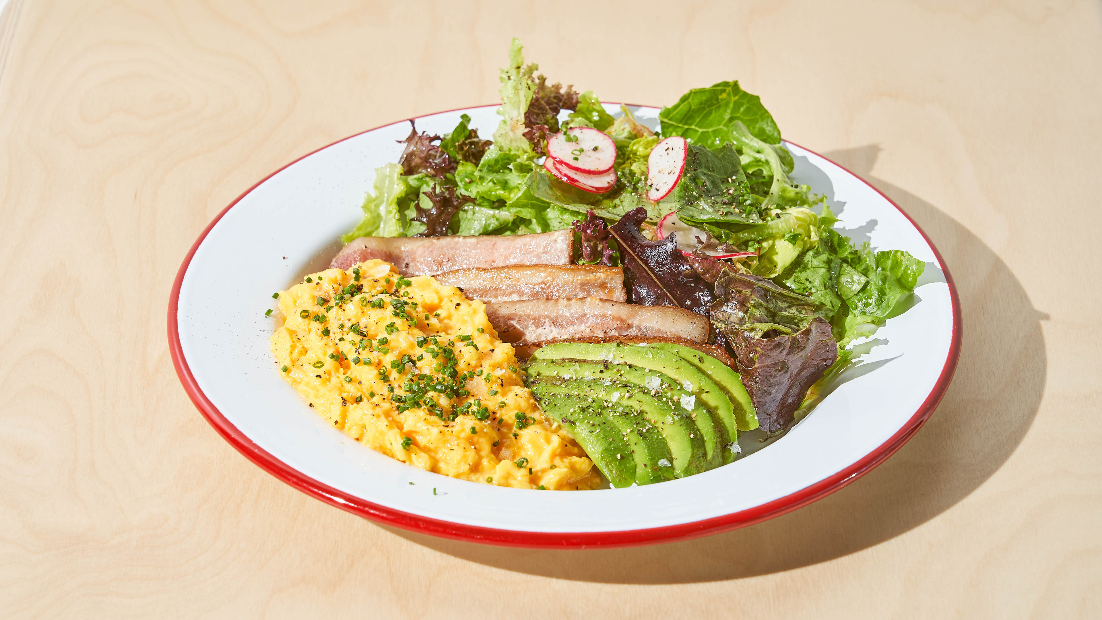 Soft scrambled eggs, applewood smoked bacon, avocado, and a lemon vinaigrette side salad