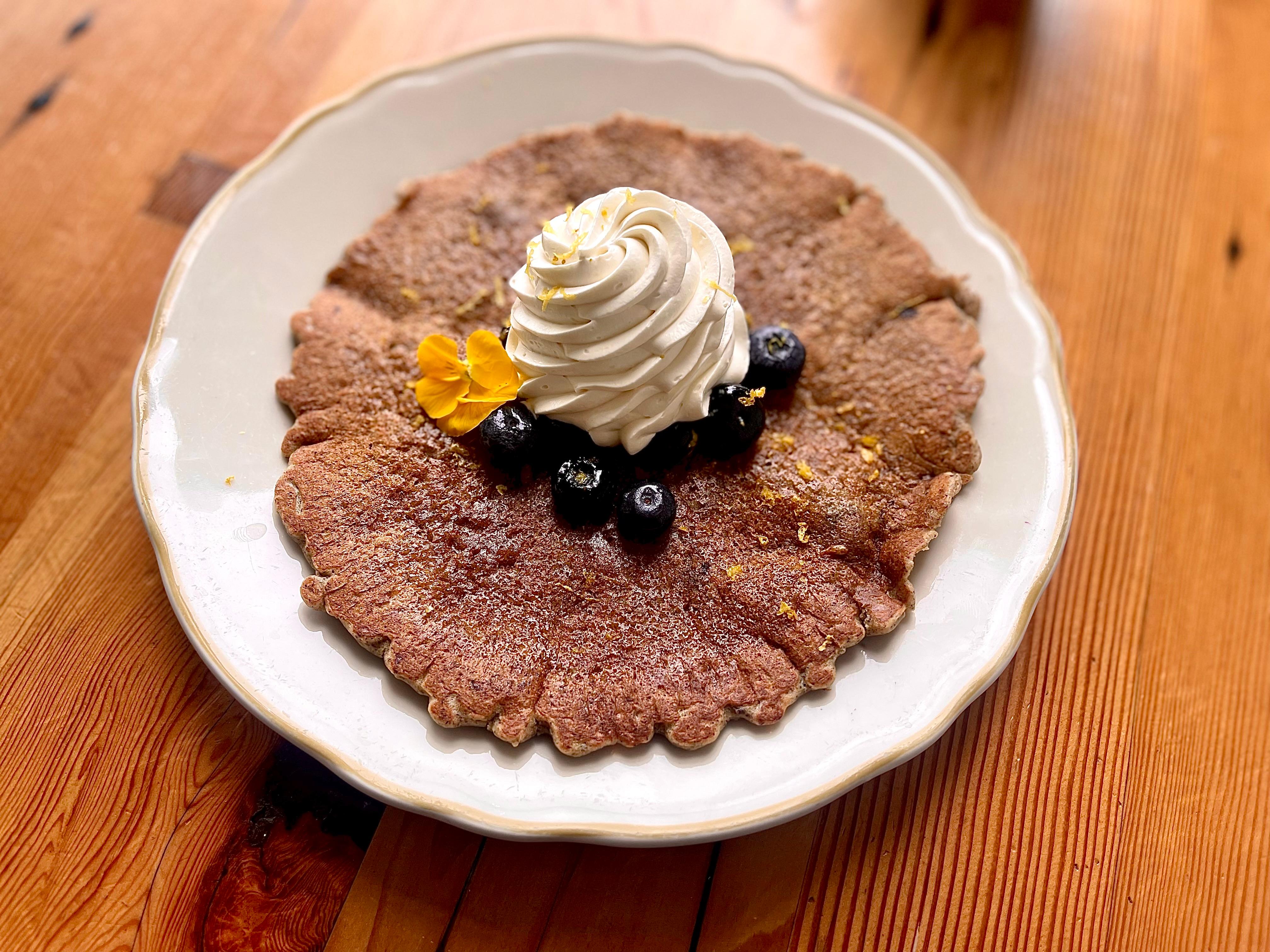 organic oat, buckwheat, & corn flour blend pancakes with blueberries and lemon butter. Topped with vegan lemon cream & blueberries. | allergens: coconut, corn