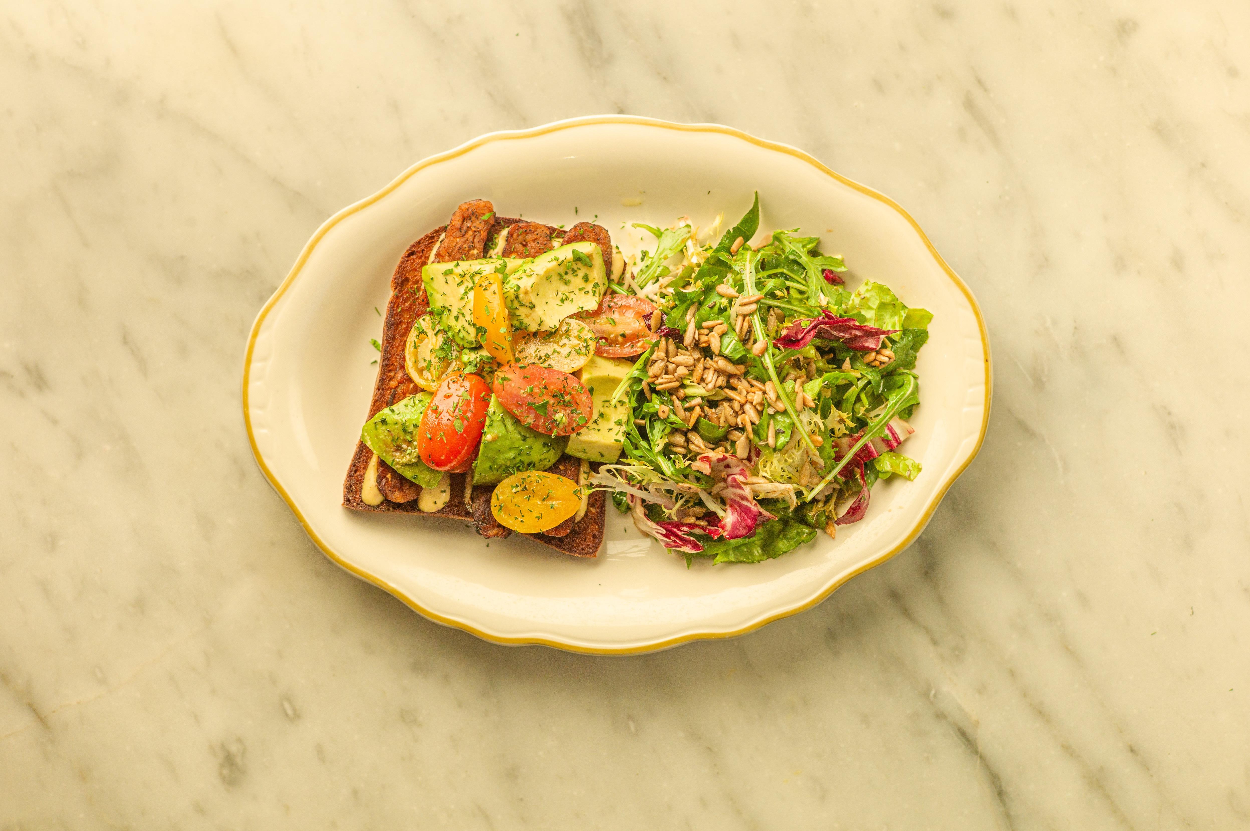 maple tempeh strips, avocado dressed in olive oil & herbs, cherry tomatoes, & dijon aioli served open faced on a single slice of toasted gluten-free brioche ~ served with mini Messina salad | allergens: coconut oil, onion, soy