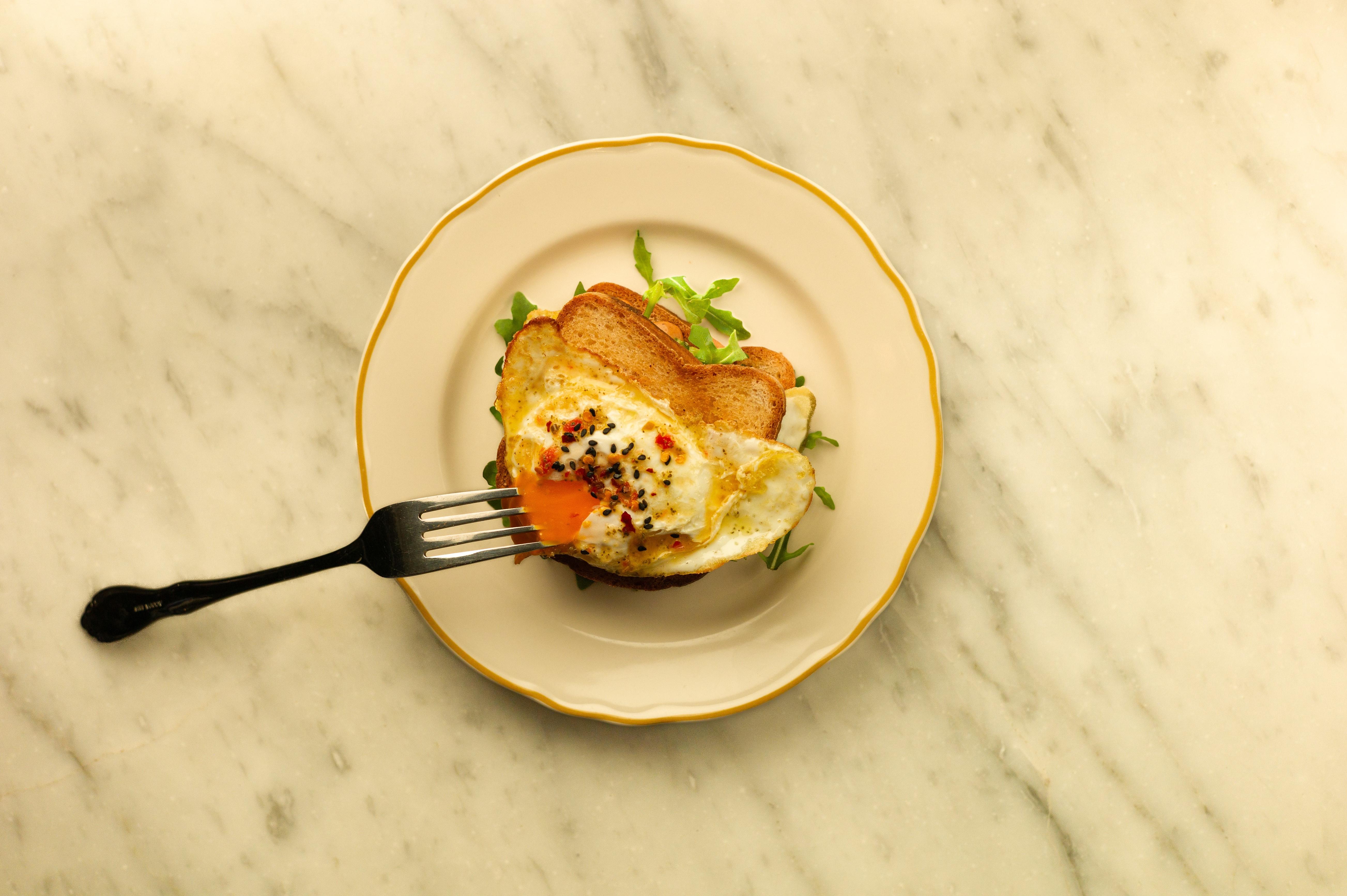 two fried eggs layered between griddled millet bread, smashed avocado, arugula, chipotle cream ~ topped with chili lemon dressing, black sesame seeds, chili flakes | allergens: onion