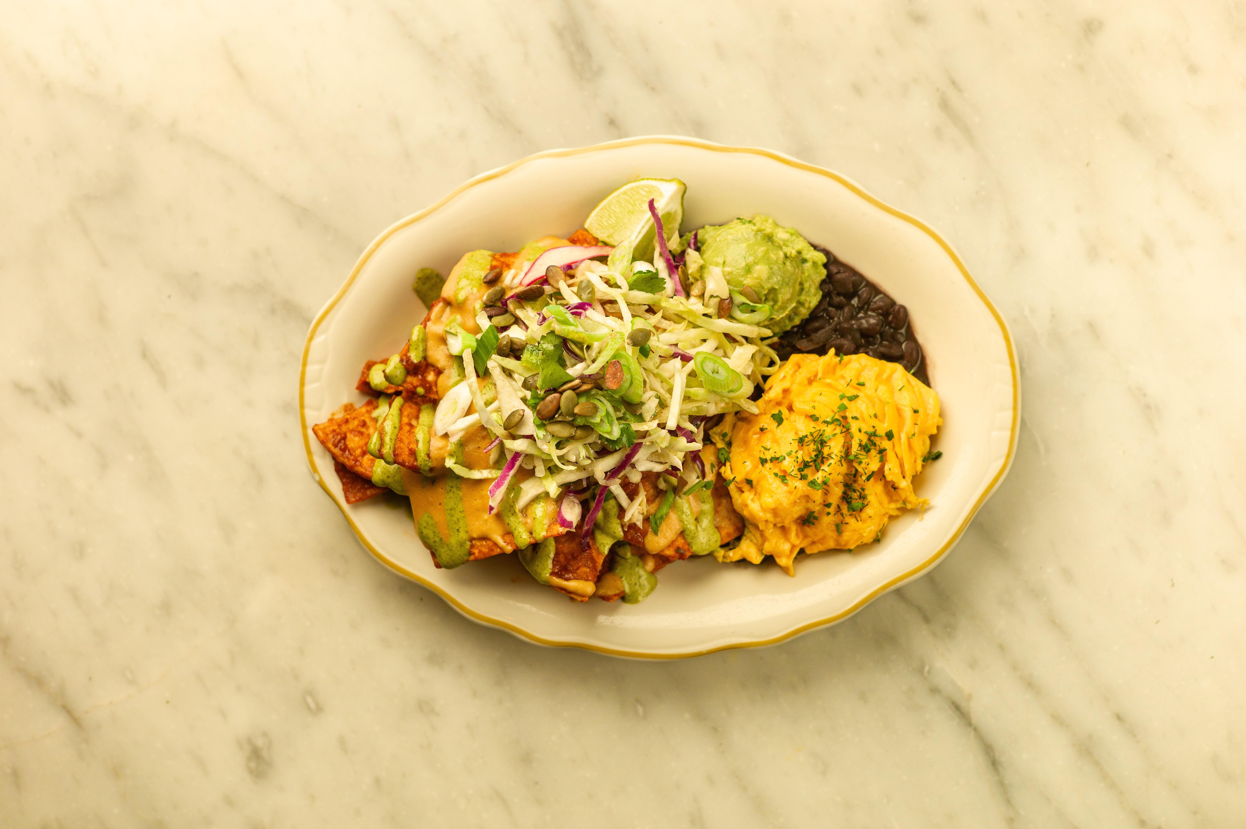 tortilla chips, enchilada sauce, black beans, slaw, avocado mash, cashew queso, cilantro cream, toasted pepitas, green onion ~ served with choice of eggs, tofu scramble, or JUST Egg™ | allergens: cashew, corn, garlic, onion