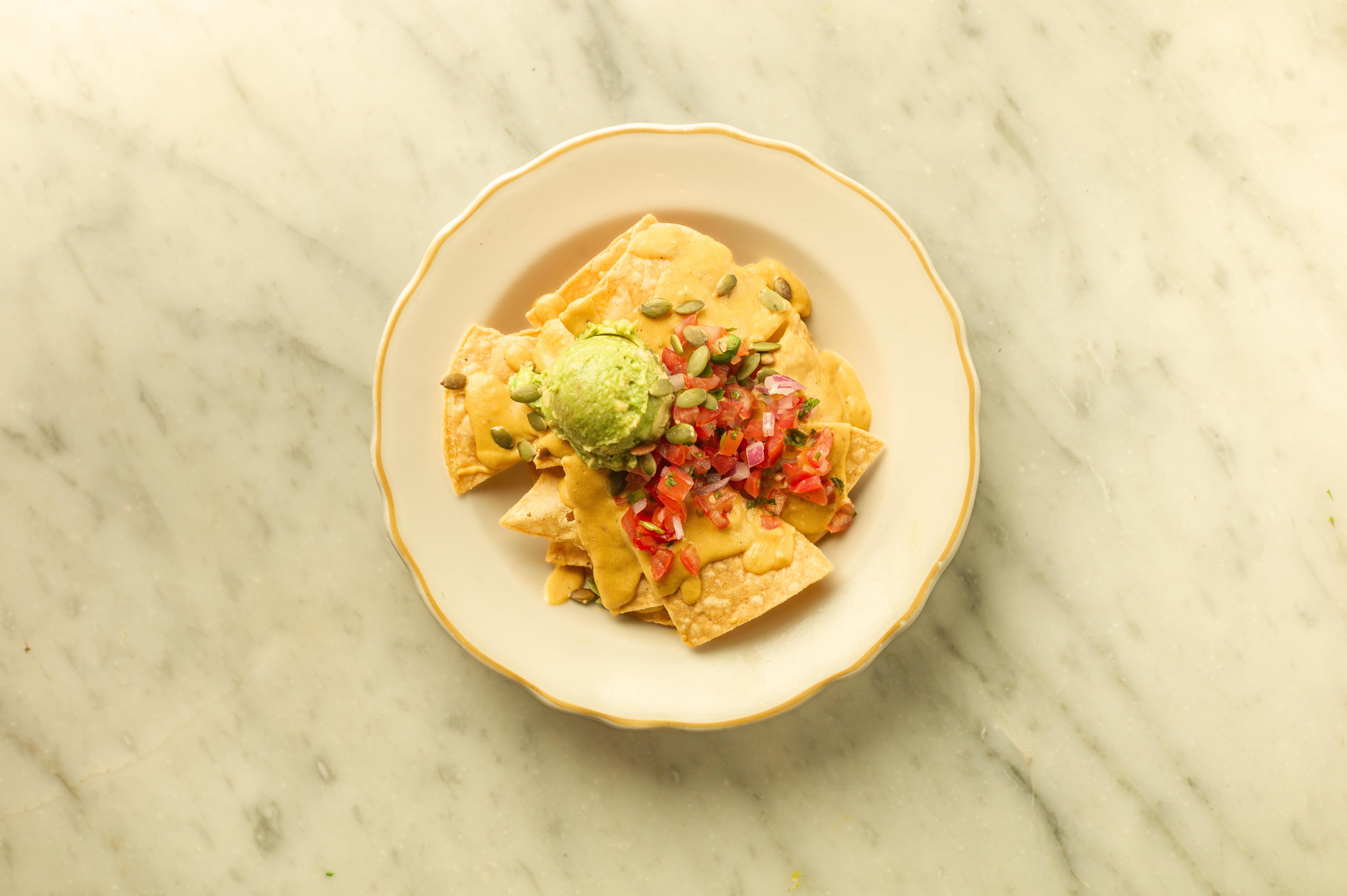 tortilla chips & cashew queso. Make it Nachos! We'll add black beans, pico de gallo, avocado mash | allergens: cashews, corn, garlic, onion