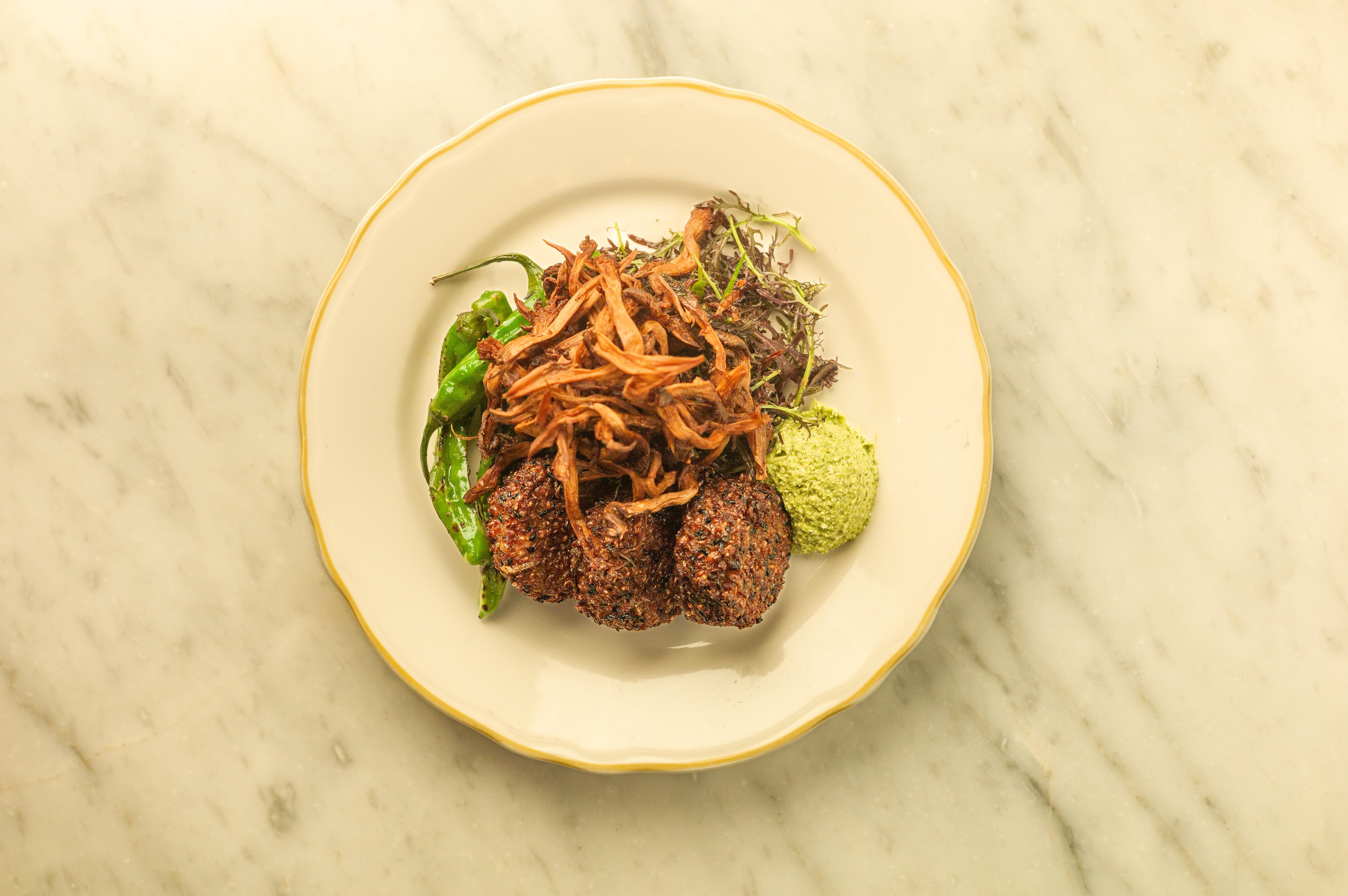 sesame brown rice cakes, crispy oyster mushrooms, cilantro ginger chutney ~ served with mustard greens & seared shishito salad with chili lemon dressing | allergens: cashews, garlic, onion