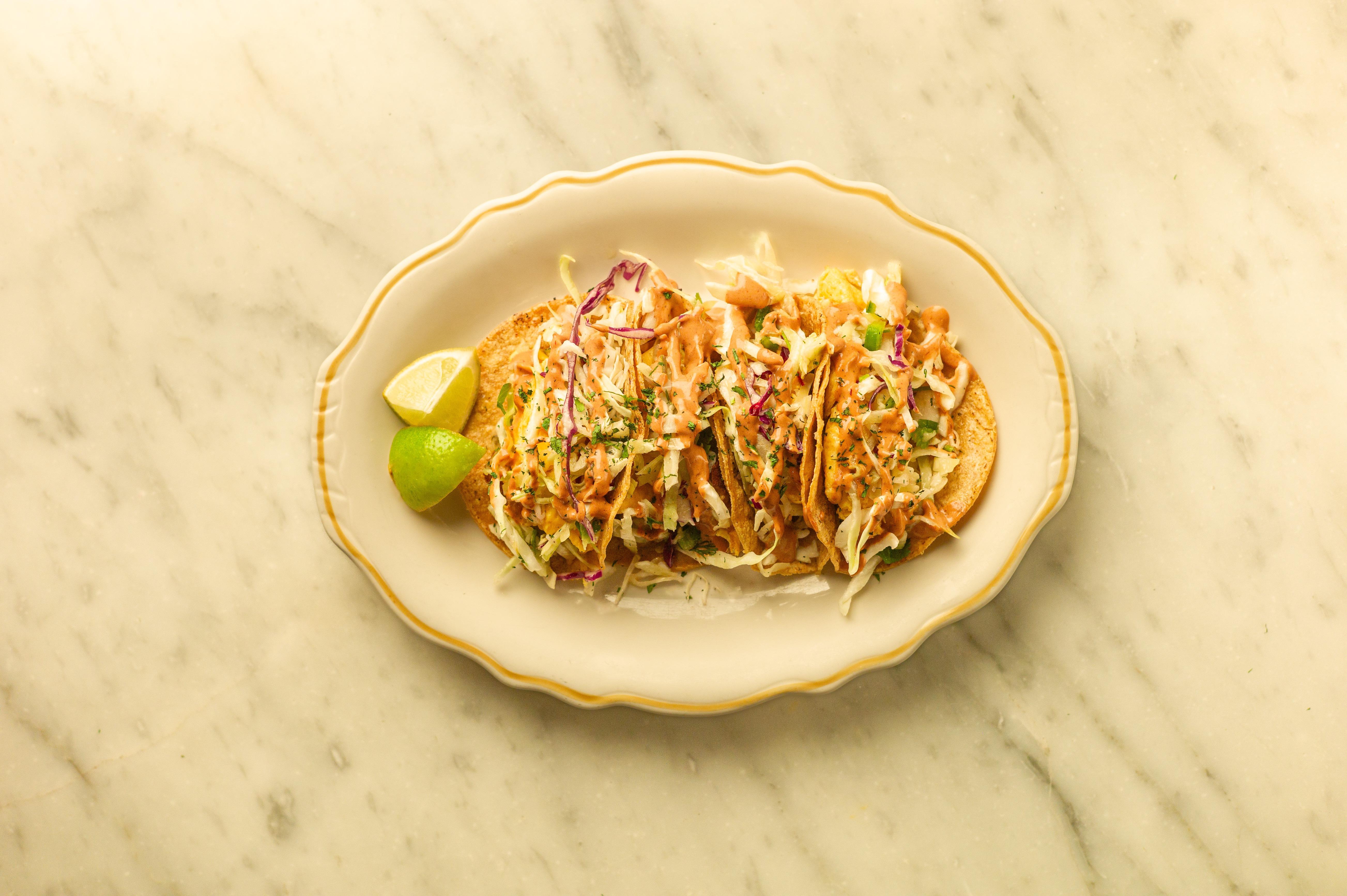 four organic corn tortillas with poblano potato mash, slaw, chipotle cream ~ served with choice of scrambled eggs, tofu scramble, or JUST Egg™ | allergens: corn, garlic, onion