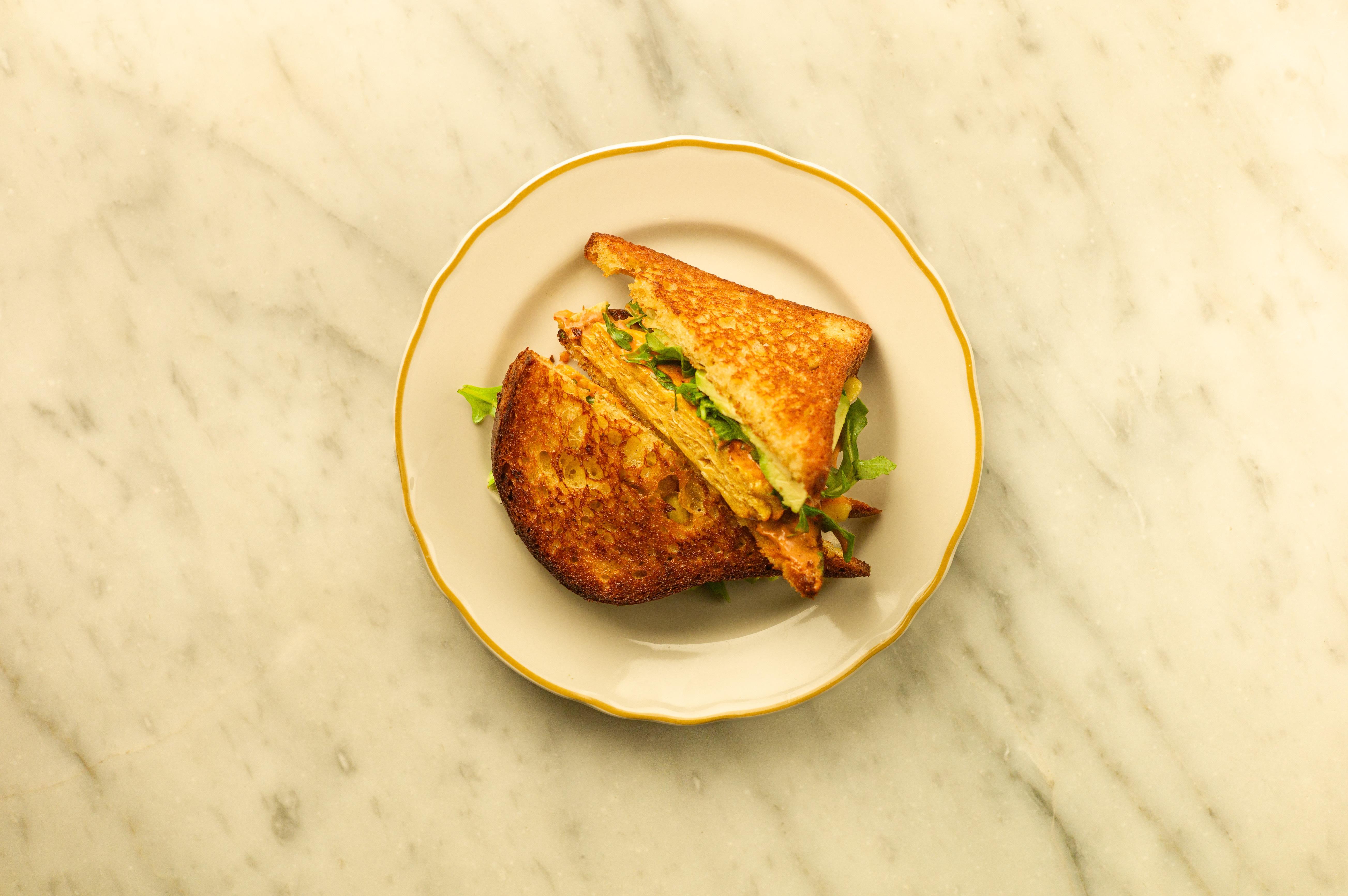 griddled gluten-free brioche, vegan provolone cheese, chipotle cream, sliced avocado, arugula ~ served with choice of eggs, tofu scramble, or JUST Egg™ | allergens: coconut oil, corn