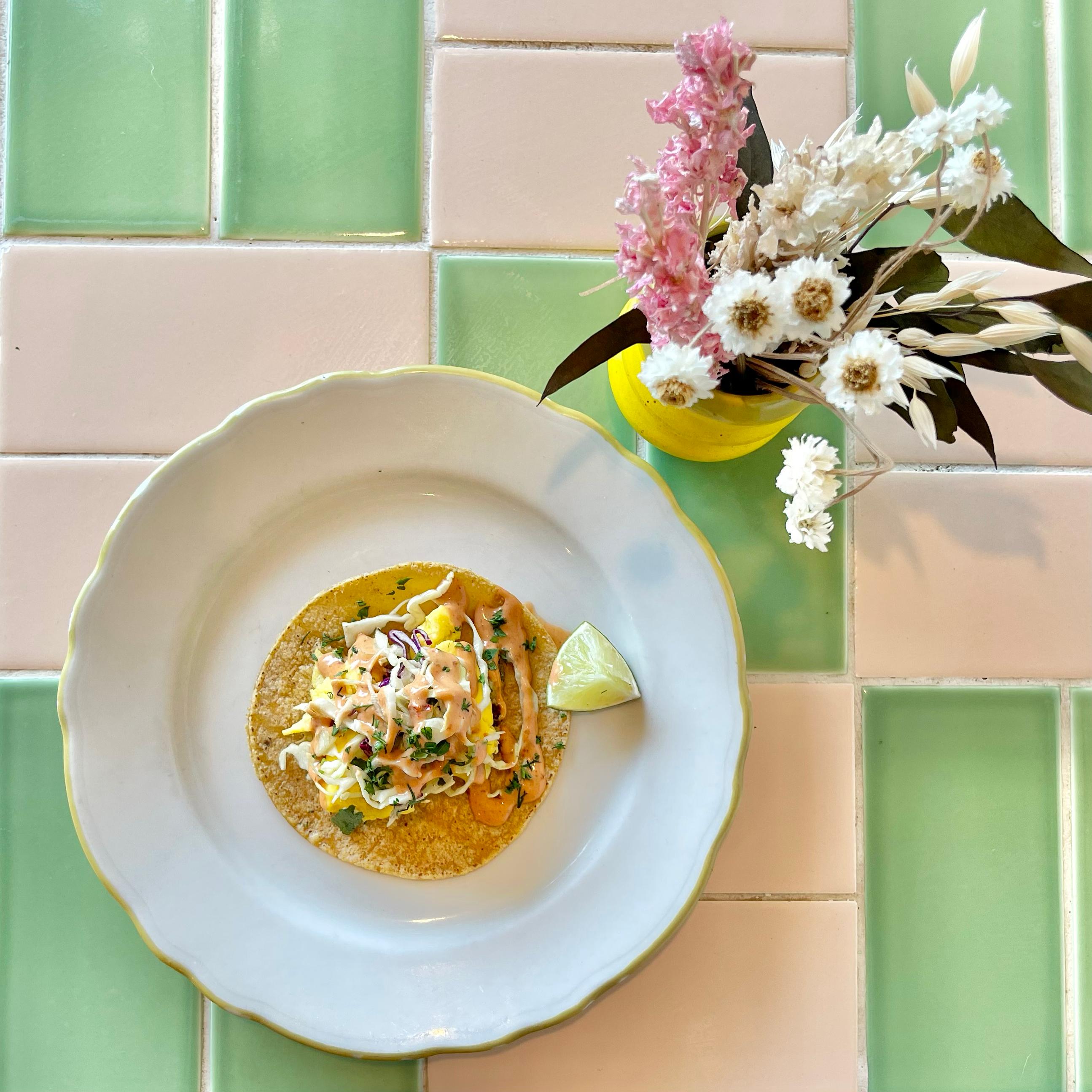 single breakfast taco. organic corn tacos with poblano potato mash, slaw, chipotle cream with your choice of eggs, tofu scramble, or JUST Egg.