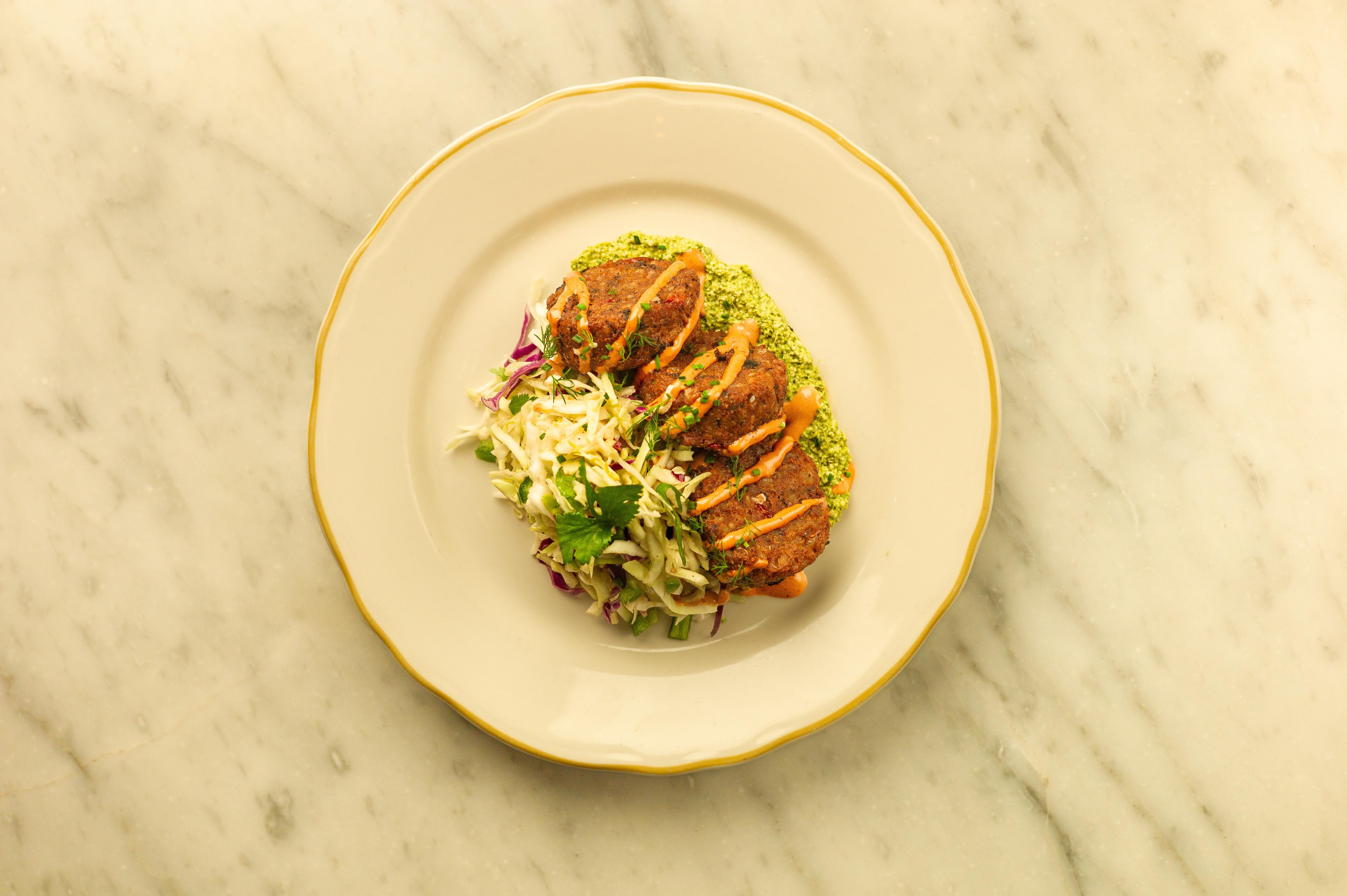 black bean & brown rice cakes, serrano slaw, chipotle cream, cilantro ginger chutney | allergens: cashews, garlic, onion