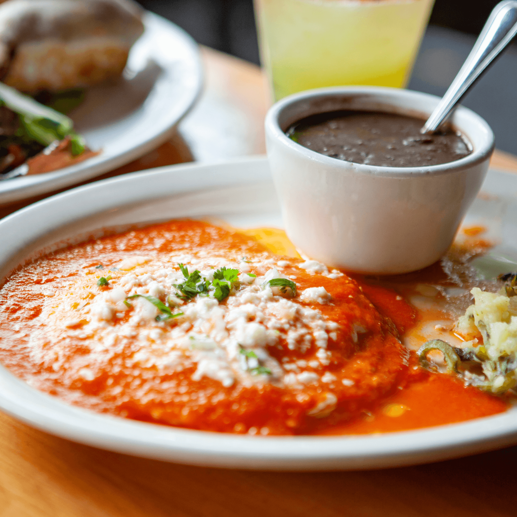 Eggs, Sunny-side-up, on lightly crisped Corn Tortilla, with Spicy Salsa Morita. Served with Refried Black Beans and Papa con Rajas. Finished with Queso Fresco, Onion & Cilantro.