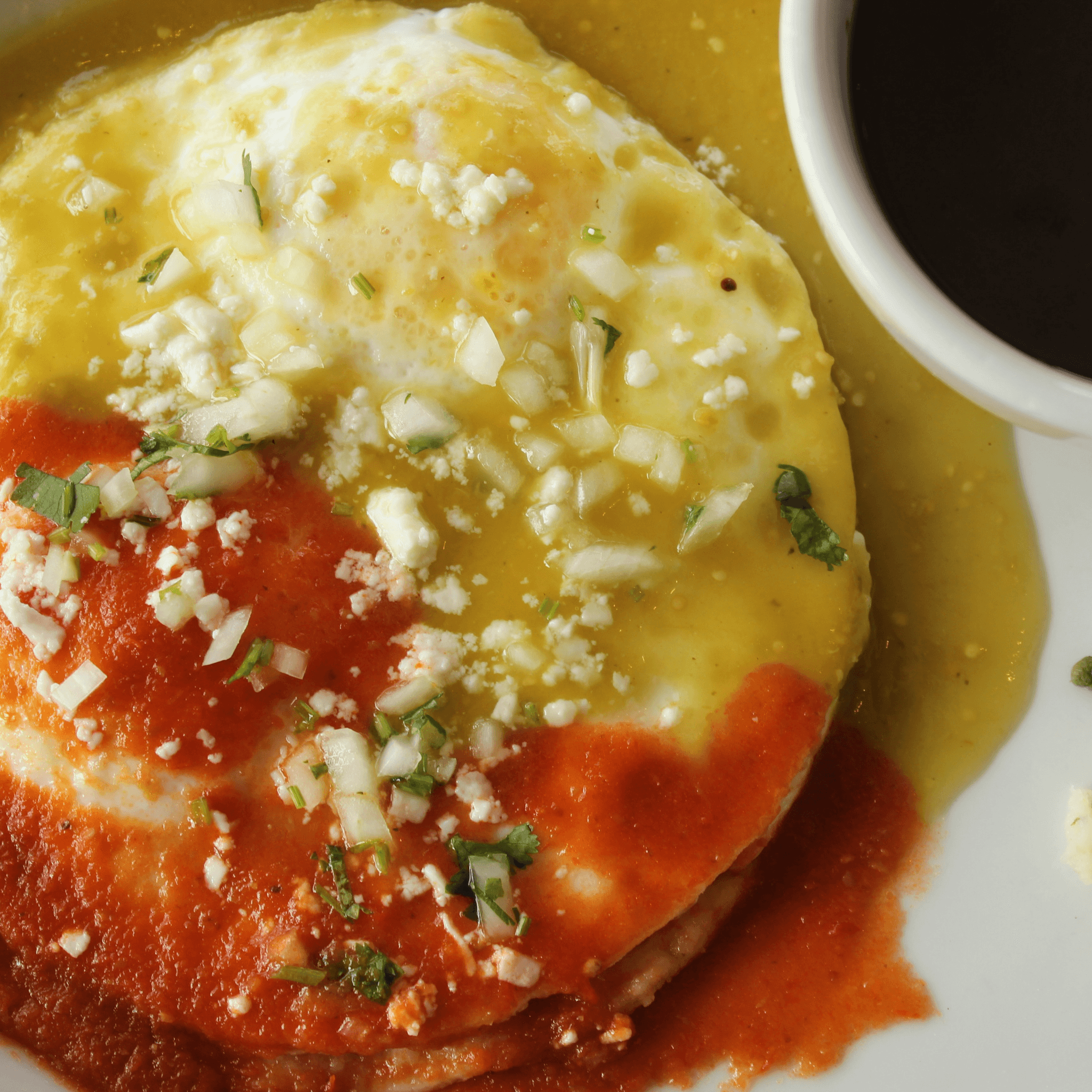 Eggs, Sunny-side-up, on lightly crisped Corn Tortilla, with fresh Salsa Ranchera and Salsa Verde. Served with Refried Black Beans and Papa con Rajas. Finished with Queso Fresco, Onion & Cilantro.