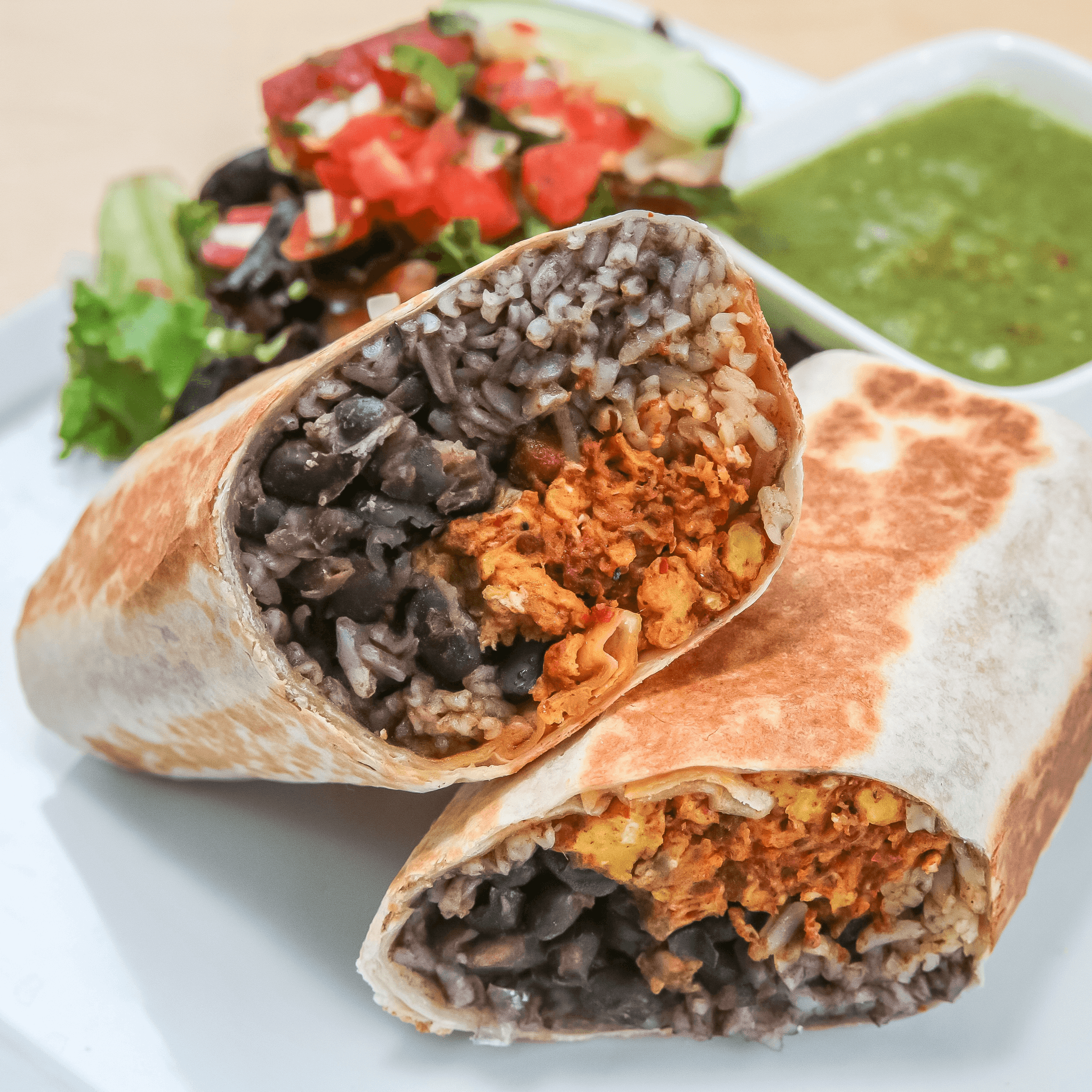 Potato and Poblano Peppers. White Rice, Refried Black Beans, Tomatillo Salsa, Onion, Cilantro, and Queso Fresco, rolled in a Toasted Flour Tortilla.