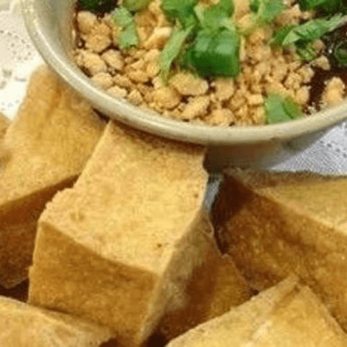 Peanut allergy alert. Deep fried tofu, served with sweet & sour sauce and crushed peanut.