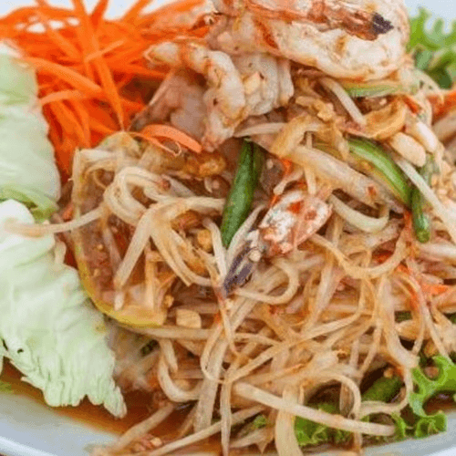 Very spicy dish. Peanut allergy alert. Gluten-free. Popular dish. It is Tum Thai but add pra ra and black crab paste.