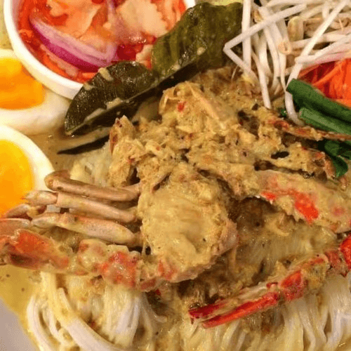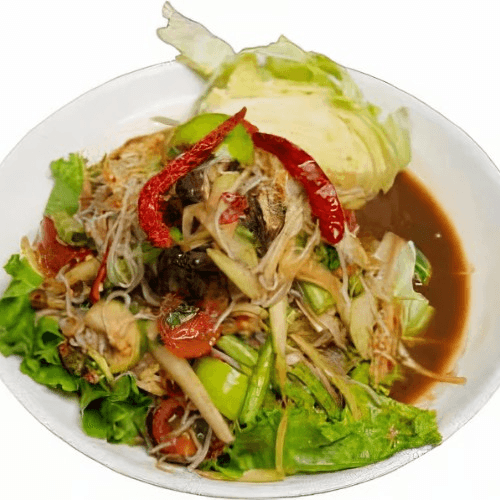 Very spicy dish. Gluten-free. Popular dish. Salted crab, black crab paste, fermented fish sauce, vermicelli rice noodle.