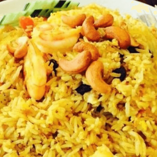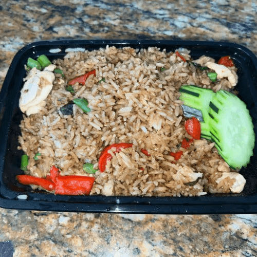 Peanut allergy alert. Popular dish. Fried rice with chicken, shrimp, pineapple, eggs, tomatoes, onions, cashew nuts, raisins, and curry powder.