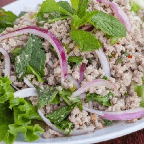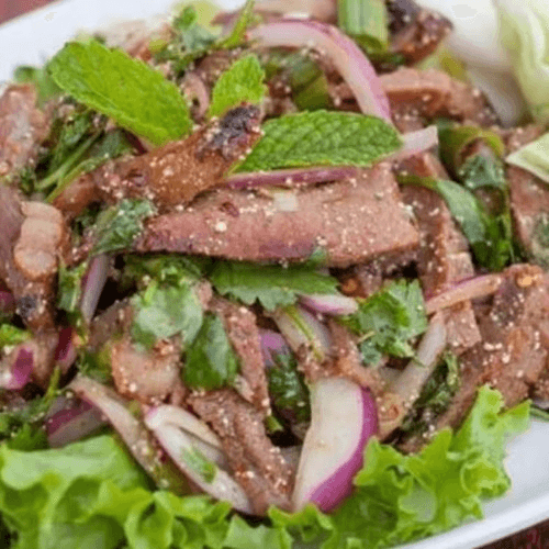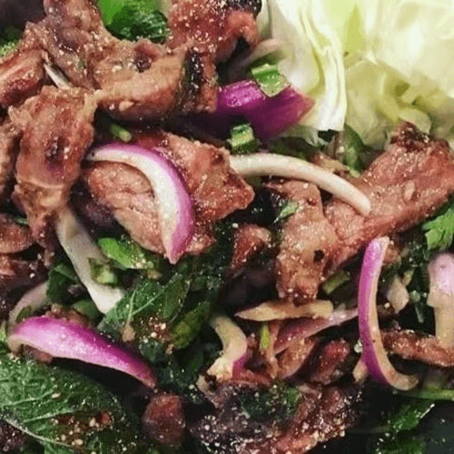 Very spicy dish. Gluten-free. Popular dish. With red onion, green onion, mint, cilantro, and roasted rice powder.