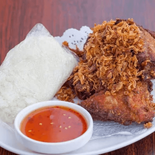 Popular dish. (During busy hours could take at least 30 mins). Southern Thai-style fried chicken, served with sticky rice, fried shallot, and sweet chili sauce.