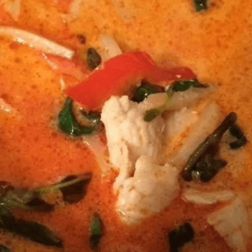 Very spicy dish. Choice of protein, red curry paste, coconut milk, sweet basil, bamboo shoots, and red bell pepper.