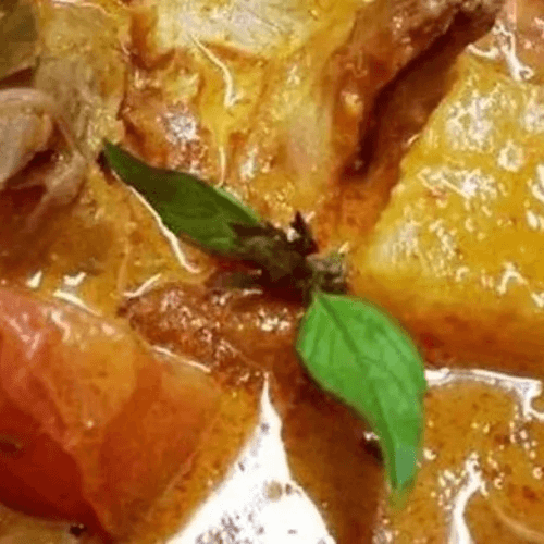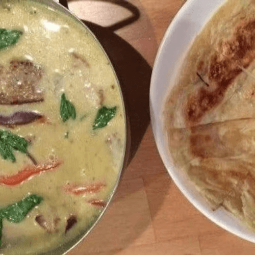 Peanut allergy alert. Very spicy dish. A rich and creamy Thai curry with Indian influences that has the aromatic taste of cinnamon, cardamom, containing potato, onions, and peanuts, served with roti bread. Rice is not included.