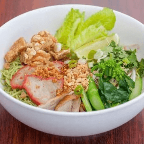 Peanut allergy alert. Noodles with BBQ pork, pork ball, ground pork, sliced fish stick, bean sprouts, green beans, peanut, cilantro, green onions, in special house broth.