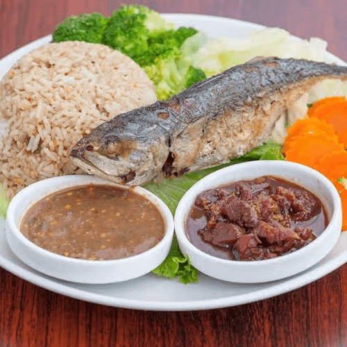 Very spicy dish. Popular dish. Gluten-free. (Chef Pla's mom special recipe) ข้าวผัดน้ำพริกกะปิ ปลาทู หมูหวาน ผักต้ม. Served with fried mackerel, braised sweet pork, and steamed vegetable.
