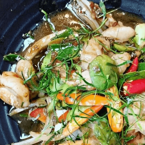 Very spicy dish. Gluten-free. Popular dish. Salted crab, black crab paste, and fermented fish sauce.