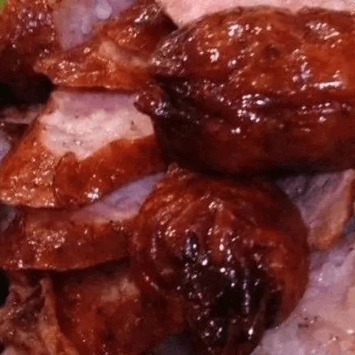 BBQ pork, crispy pork, Chinese pork sausage, hard-boiled egg, over jasmine rice with house special gravy.