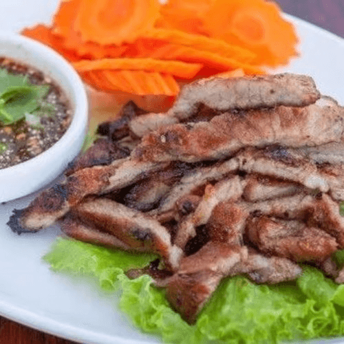 Popular dish. (During busy hours could take at least 30 mins). Grilled Thai-style marinated beef served with spicy lime fish sauce.