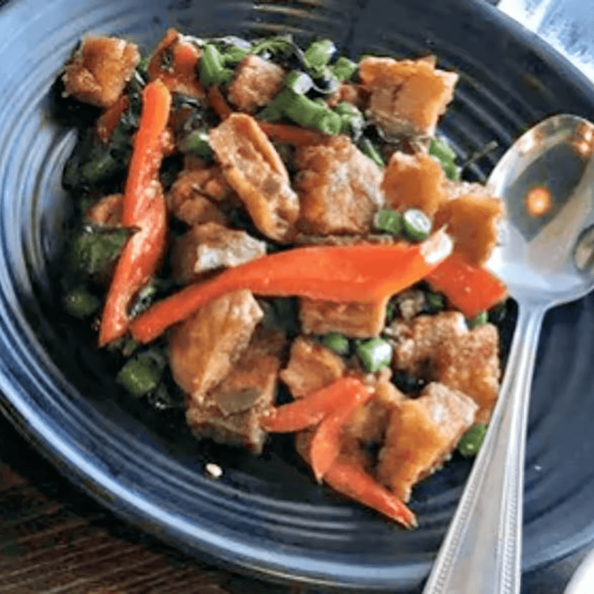 Very spicy dish. Popular dish. Choice of protein with sweet basil, green beans, and red bell pepper. Served over Jasmine rice.