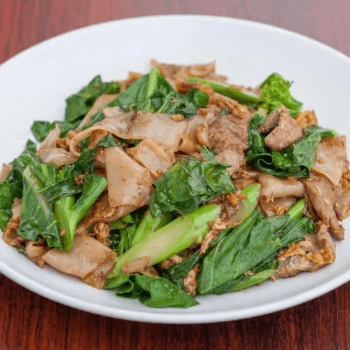 Popular dish. Stir-fried flat rice noodles with a choice of protein, Chinese broccoli, and egg, in black sweet soy sauce.