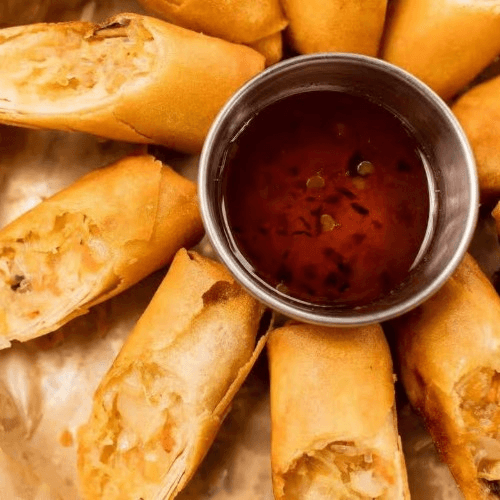 Popular dish. Deep-fried mixed veggie egg rolls, served with sweet & sour sauce.