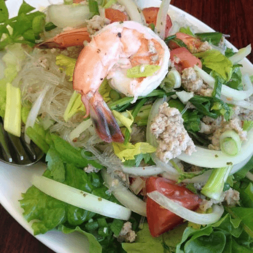 Very spicy dish. Gluten-free. Glass noodles, ground pork, shrimp, red onion, green onion, cilantro, Chinese celery, and tomato, with spicy lime dressing.