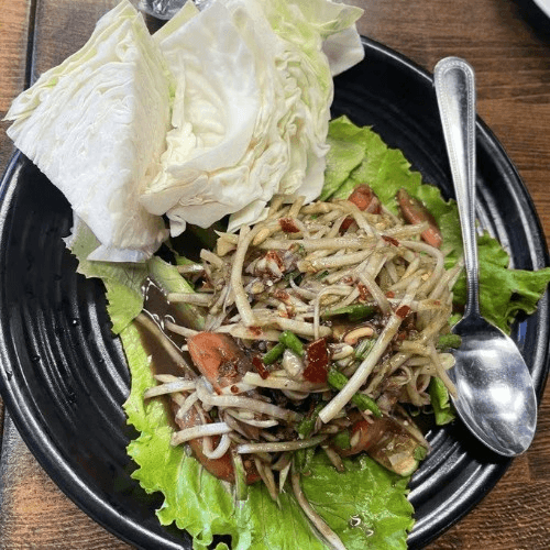 Very spicy dish. Gluten-free. A signature of Lao-style green papaya salad, distinct from the Thai version. Thin slice of green papaya, tomato, long beans, garlic, chilies, lime, fish sauce, and Pladaek.