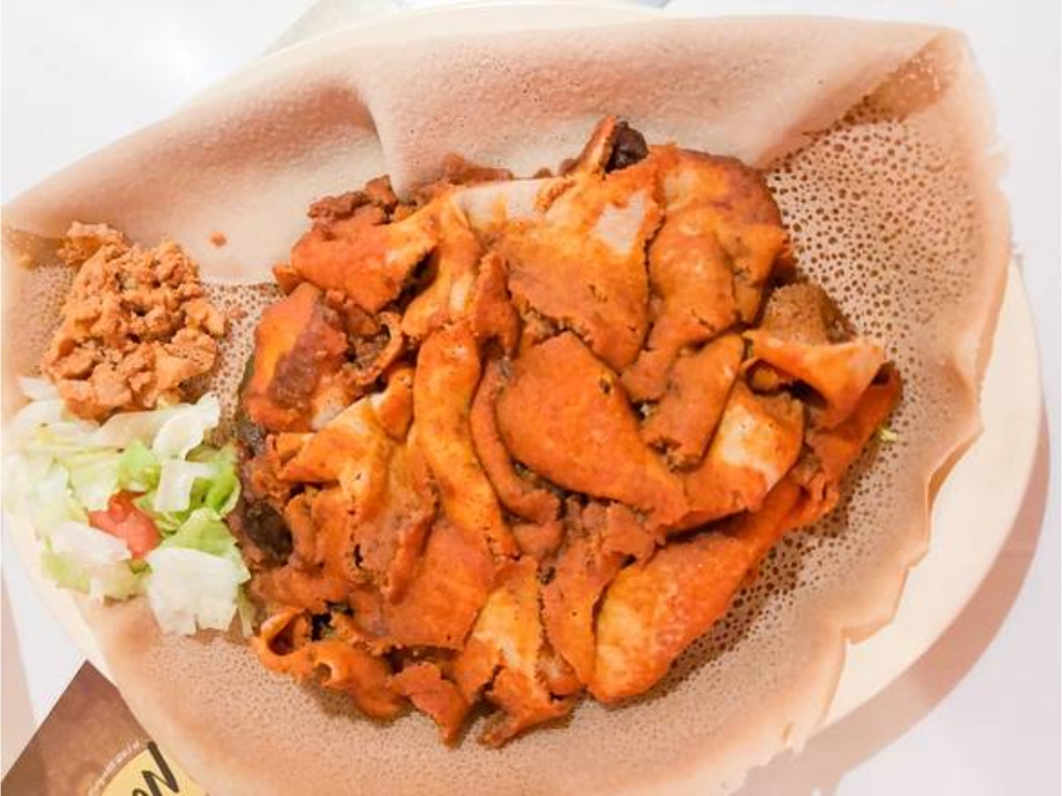 Sauteed strips of beef with onions and red peppers tossed in injera.