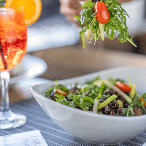 Romaine & arugula, red onion, cherry tomatoes, carrot, zucchini, egg, and parmesan in a prosecco vinaigrette