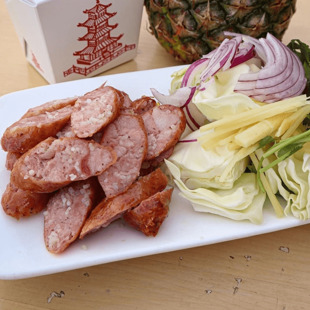 Thai style sour pork sausage with cabbage cilantro, peanuts, and chili.