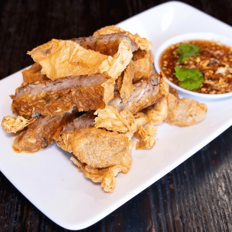 Marinated pork, traditionally sun-dried and deep-fried, served with a tangy and spicy dipping sauce.