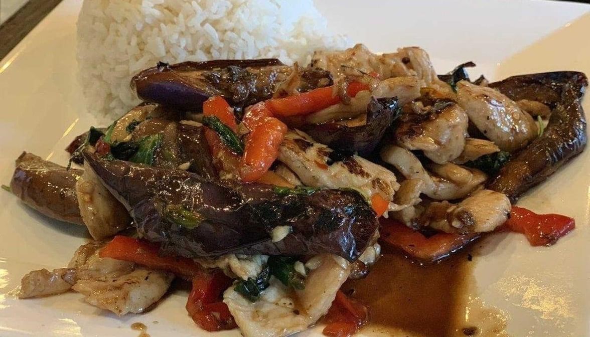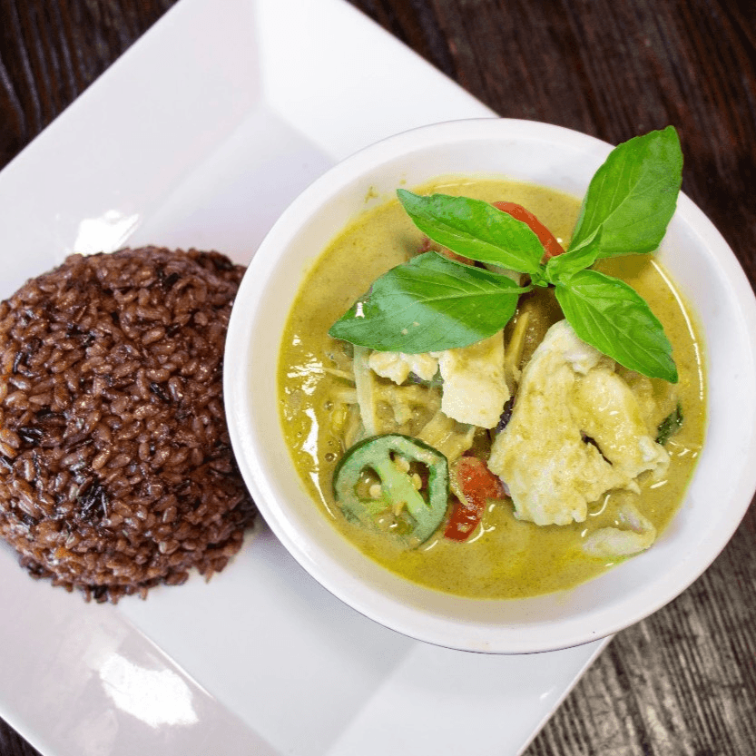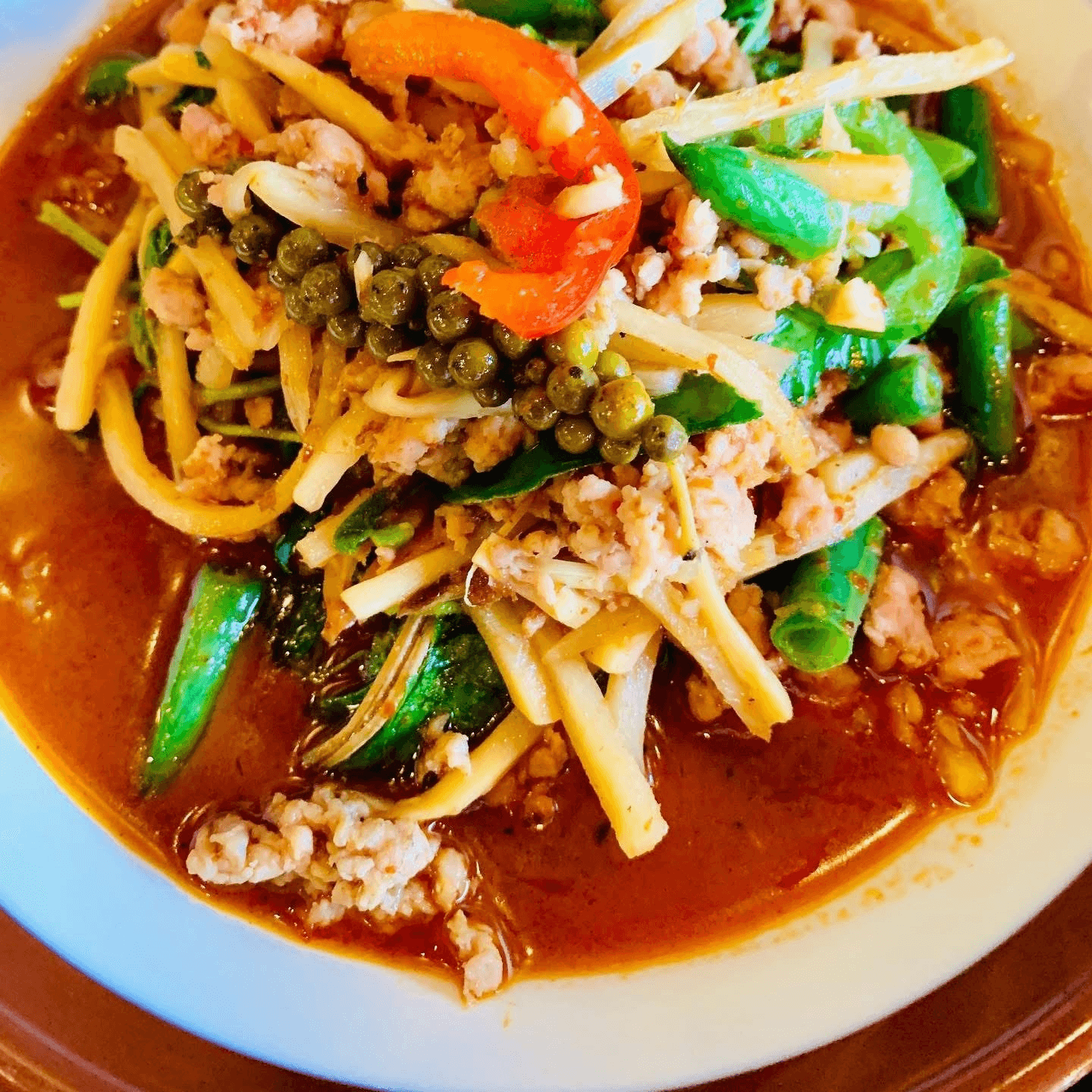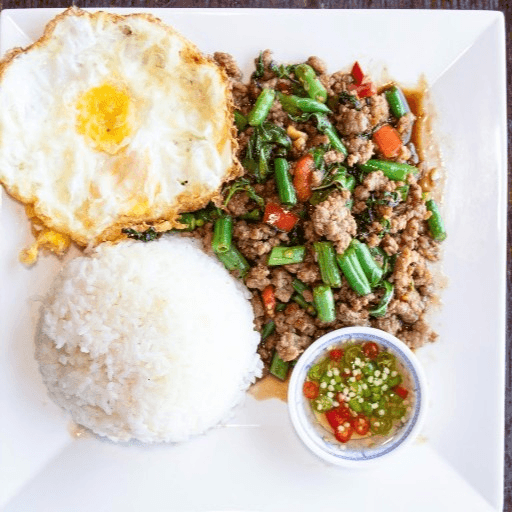 Green beans, chili, basil and bell peppers with choice of protein (thai style ground pork or ground chicken).