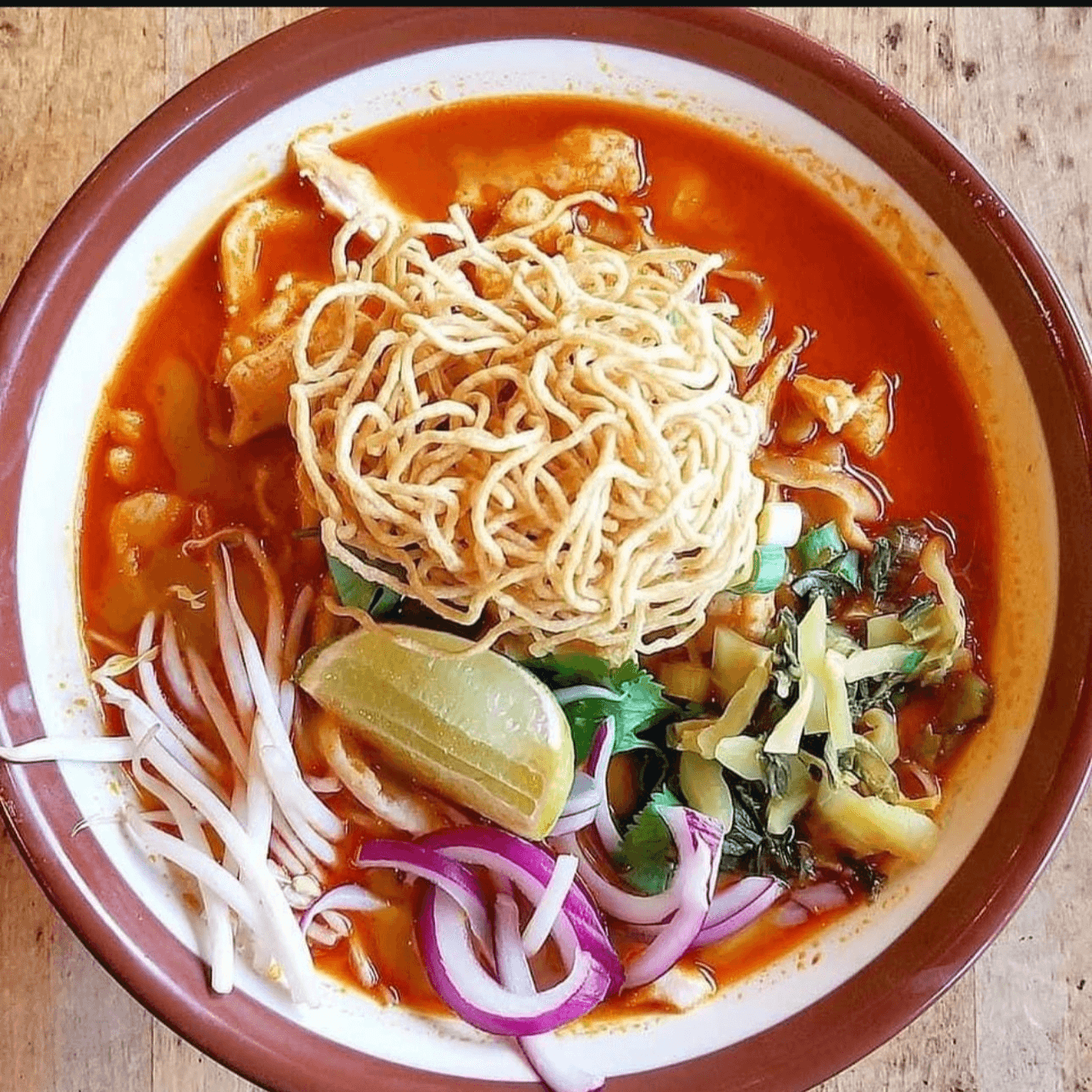 Egg noodles, light yellow curry broth, crispy noodle, side of bean sprouts, pickle mustard, green and red onion.