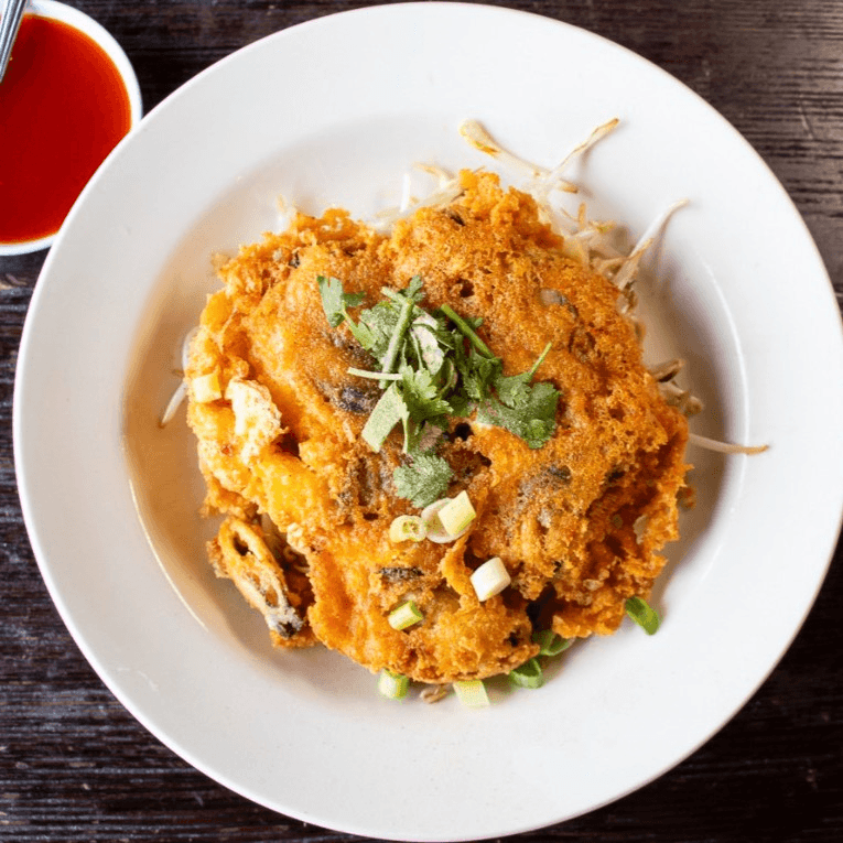 Mussels and scallions fried in a crispy egg pancake on a bed of beansprouts with sweet chili sauce on the side.