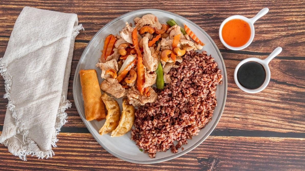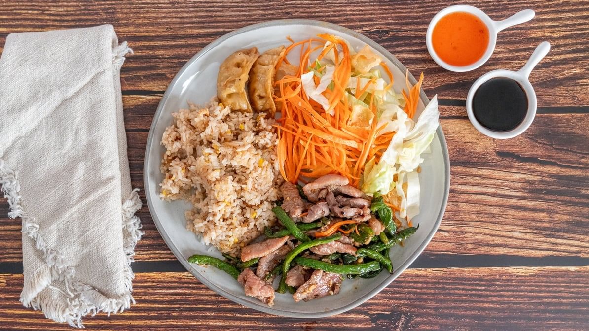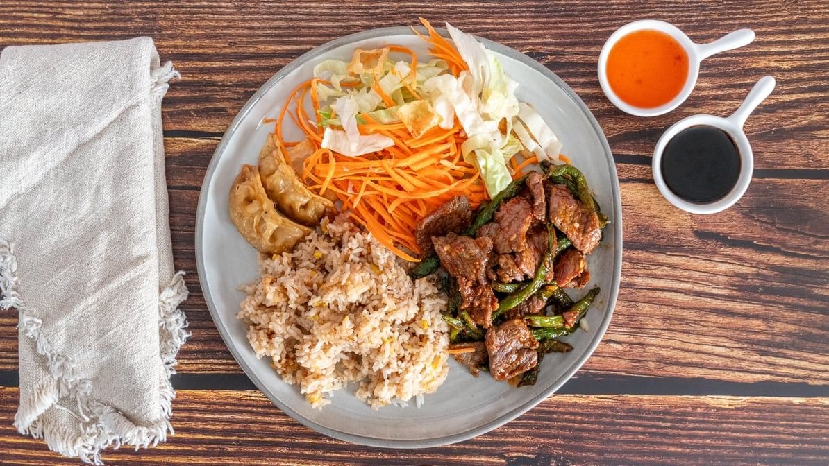 1 main dish /choose 2 side dishes /choice of rice choose 2 side dishes -vegetable pot stickers -vegetable egg roll -chopped sesame salad choice of rice -steamed white rice -garlic rice (add $1) -egg fried rice (add$1) -brown & black rice (add$1) choice of chicken, pork, tofu, or vegetables (beef add $1, shrimp add $3, crispy pork add$2, fish add$3, seafood add$4.