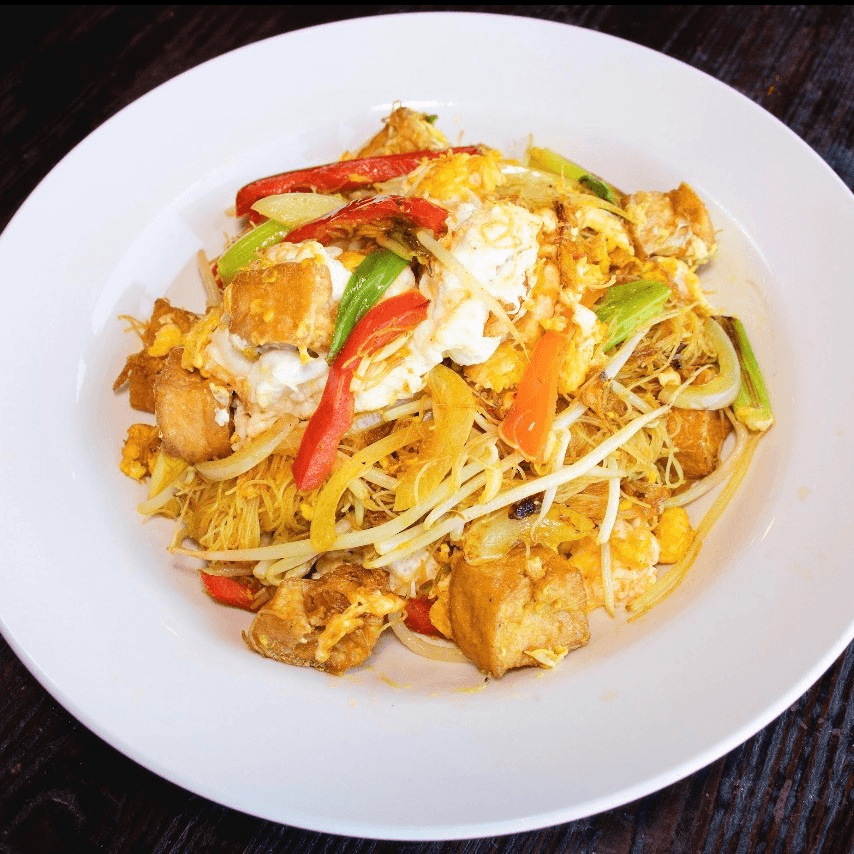 Rice stick noodles, white onion, green onion, and silken tofu or vegetables with bean sprouts, jalepeno, hoisin and sriracha on the side. This is a vegetable dishes. We are NOT a certified vegan restaurant.
