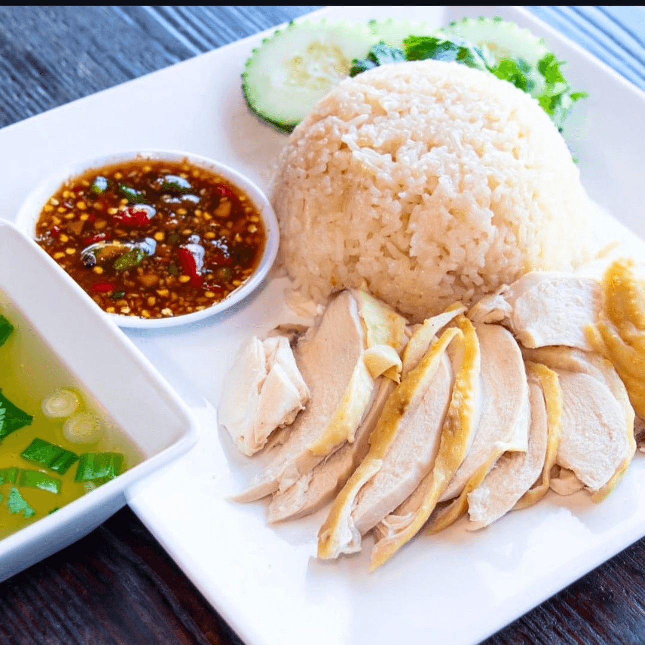 Steamed chicken and garlic rice, with spicy soy ginger sauce and a side of chicken broth.